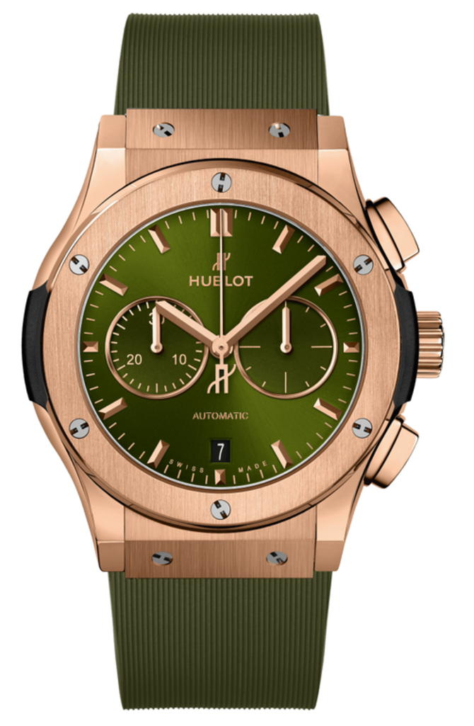 Спортивные швейцарские часы от компании Hublot с функцией хронографа, модель Classic Fusion Chronograph King Gold Green, выпущены в круглом корпусе из розового золота в диаметре 42 мм, где заключен мануфактурный часовой механизм HUB1153 с автоподзаводом и запасом хода на 42 часа. Сквозь противобликовое стекло из сапфирового кристалла на циферблате показываются данные текущего времени, даты, а также показания хронографа. Часовые метки и стрелки для индикации данных произведены из золота. Безель крепится на корпусе титановыми винтами в форме заглавной буквы названия производителя - Н. Ремень из каучука зеленого цвета и застежка из золота зафиксируют часы на запястье руки. Корпус обладает 50-метровой влагостойкостью.