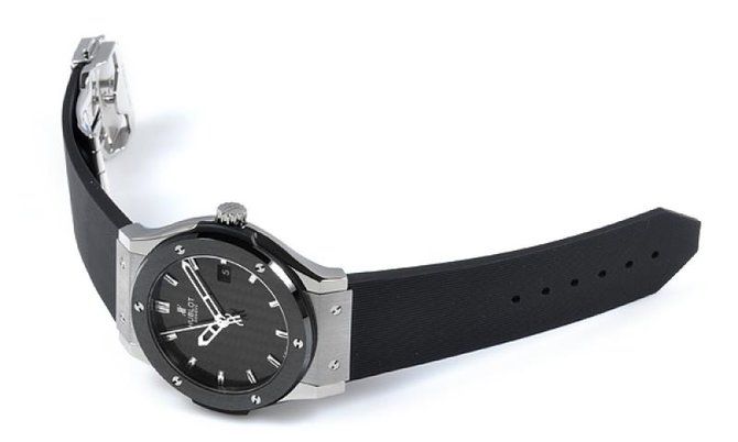 Очередная великолепная модель мужских наручных часов Fusion Zirconium Ceramic 542.ZM.1670.RX от производителя Hublot не оставит к себе никого равнодушным, потому как завораживает своим внешним классическим видом и функциональностью. Круглый комбинированный корпус выполнен из таких материалов как цирконий и керамика, и имеет такие размеры: 42 мм в диаметре. Автоматический механизм данной модели оснащен калибром HUB 1110, и имеет запас хода на 40 часов. Прочные сапфировые стекла, устойчивые к царапинам и другим повреждениям закрывают корпус с обеих сторон. Апертура с датой находится на позиции 3 часа. На черном циферблате шикарно смотрятся отлитые вручную посеребренные стрелки. Водонепроницаемость модели составляет 100 футов, что равняется 30 метрам. Ремешок черный, каучуковый, оснащен циркониевой вставкой и раскладывающейся застежкой.