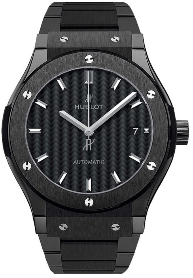 Часовая мануфактура Hublot представляет механические наручные часы Black Magic 542.CM.1771.CM в черном керамическом корпусе, диаметром 42 мм, в котором размещен механизм мануфактурного производства HUB1112. Он отвечает за индикацию на карбоновом циферблате текущего времени и текущей даты. Модель пополнила ряды коллекции Classic Fusion. Титановые винты н-образной формы фиксируют безель. Калибр с 42-часовым запасом хода. Браслет, который служит замком швейцарских часов на запястье, изготовлен из керамики. Корпус отличается 50-метровой водонепроницаемостью. Застежка раскладывающаяся. Стрелки, а также часовые метки, с родиевым напылением. Сапфировое стекло стоит на страже часов и с лицевой, и с задней стороны корпуса, которая открывает невероятный вид на работу калибра с автоподзаводом HUB1112.