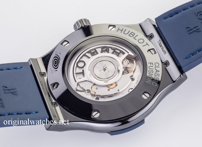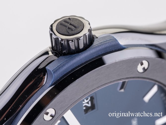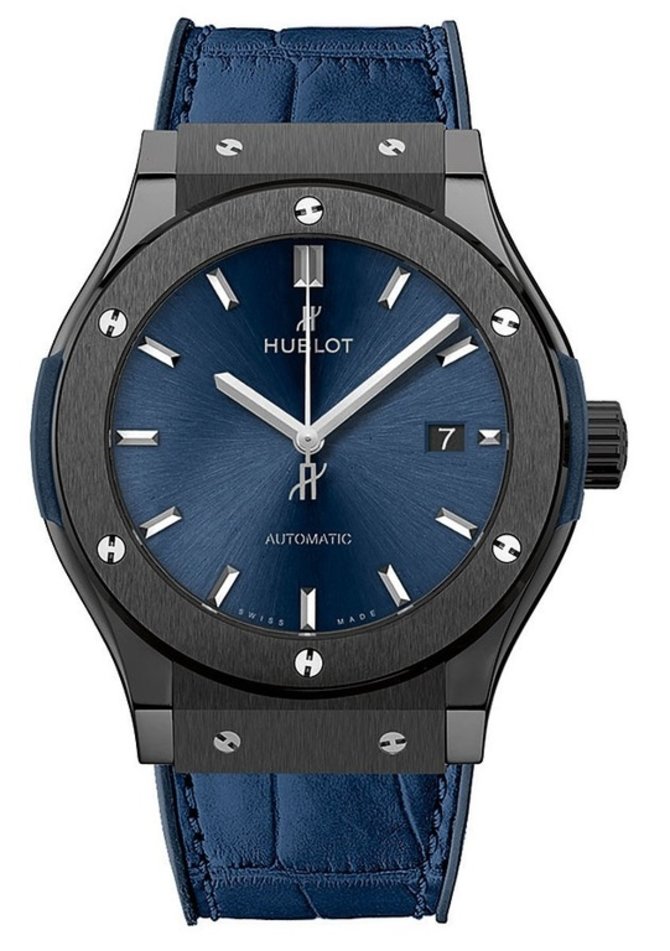 Пополнение коллекции Classic Fusion часовой мануфактуры Hublot - модель наручных классических часов в круглом керамическом корпусе, диаметром 42 мм, в котором расположен мануфактурный автоматический калибр HUB 1110 с 42-часовым запасом хода. Сквозь лицевое защитное стекло из сапфира на синем сатинированном циферблате отображаются данные часов, минут, секунд, даты. Стрелки и часовые метки - стальные. Керамический безель фиксируется титановыми винтами в форме буквы Н. Заводная головка рифленая. Дополнительной прочности крокодиловому ремешку придает каучуковая подкладка. Застежка раскладная. Корпус имеет 50-ти метровый уровень водостойкости. Частота баланса механизма - 28 800 п/час. Механизм стоит на 28 драгоценных камнях. Задняя крышка из сапфирового стекла.