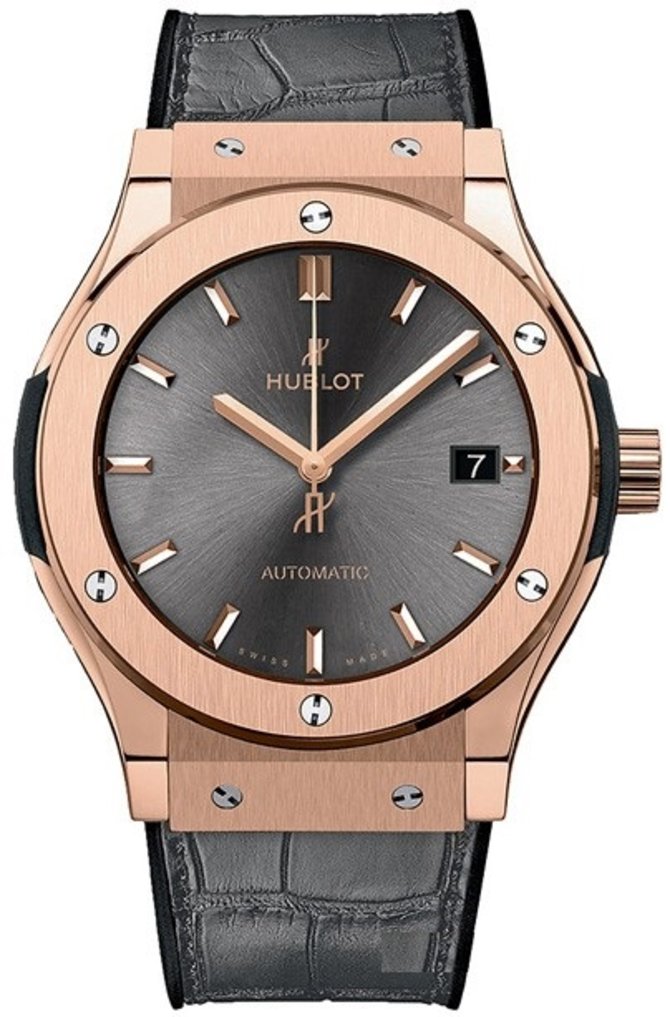 Швейцарские мужские часы с классическим дизайном, характерным линии Hublot Classic Fusion, представлены маркой в круглом корпусе из розового 18-каратного золота в диаметре 42 миллиметра. Строгий черный циферблат золотыми метками и стрелками повествует о данных часов, минут, секунд и даты. Крокодиловый ремешок, традиционно для Hublot, с каучуковой подкладкой. Винты из титана. Механизм HUB 1110 с автоподзаводом и запасом хода в 42 часа. Водонепроницаемость золотого корпуса - 50 метров. Калибр состоит из 28 драгоценных камней, имеет частоту баланса 28 800 полуколебаний в час. Стекло, которым накрыт циферблат - сапфировое.