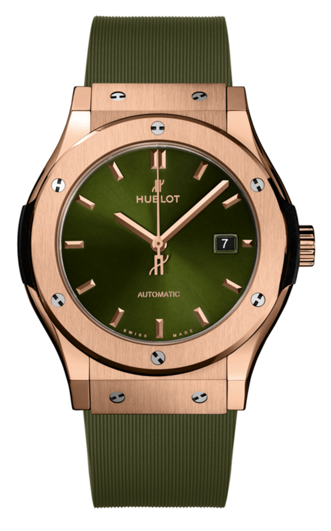 Модель золотых швейцарских часов Classic Fusion King Gold Green выпущены в круглом корпусе из сатинированного и полированного розового золота, диаметром 42 мм, где специалистами Hublot был установлен автоматический механизм HUB1110 мануфактурной разработки, который служит для индикации текущего времени в часах, минутах и секундах, а также даты. Безель зафиксирован 6-ю H-образными титановыми винтами. Зеленый циферблат накрыт высокопрочным стеклом из сапфирового кристалла с противобликовыми свойствами. Часовые метки и стрелки выполнены из золота. Корпус отличается 50-метровой водонепроницаемостью. Каучуковый ремень зеленого цвета укомплектован застежкой из розового золота.