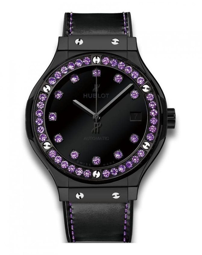 Женские механические наручные часы, выпущенные швейцарской мануфактурой Hublot, представлены в корпусе из высококачественной керамики с инкрустацией безеля 36-ю фиолетовыми аметистами. Внутри керамического 38-миллиметрового корпуса мастера компании Hublot разместили мануфактурный швейцарский механизм с автоматическим подзаводом, калибр HUB1110, обладающий 42-часовым запасом хода. Часовые метки на черном циферблате заменяют 11 фиолетовых аметистов. На кончике секундной стрелки находится логотип бренда HUB1110. Часы выполняют функцию индикации часов, минут, секунд и даты. Кожаный ремешок модели с каучуковой подкладкой и раскладной стальной пряжкой с PVD-покрытием. Безель и ремешок крепится к корпусу традиционными фирменными Н-образными винтами. Герметичность корпуса - 50 метров.