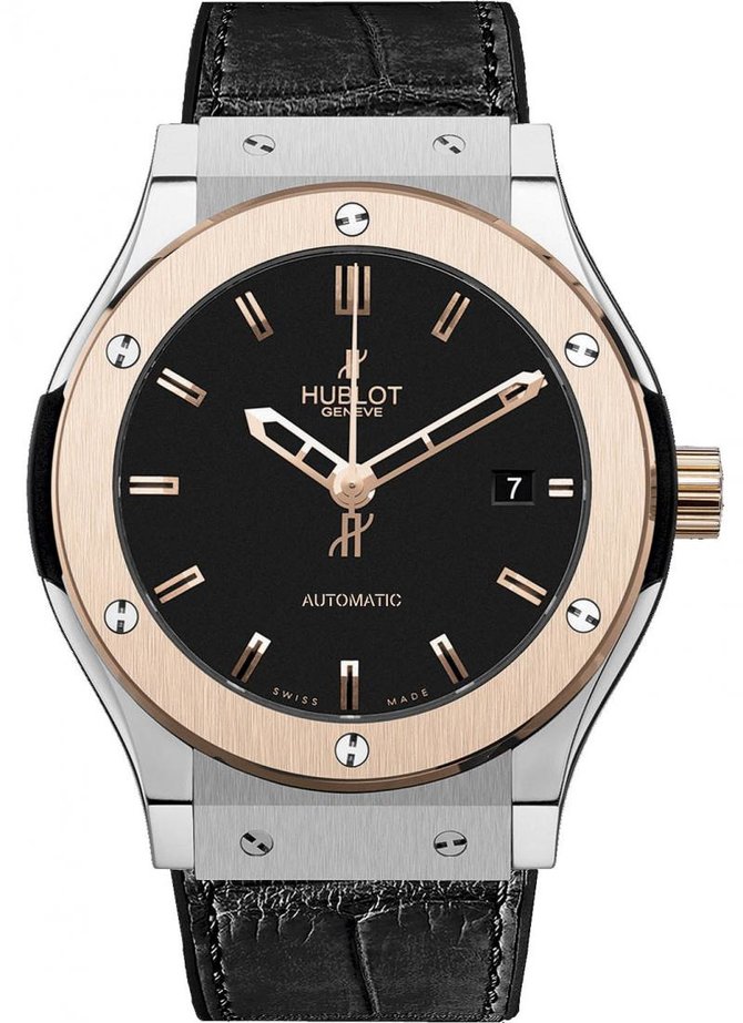 Наручные часы из коллекции Classic Fusion Titanium King Gold REF : 565.NO.1180.LR.OX от производителя Hublot завораживает своим внешним видом. Круглый комбинированный корпус выполнен из сплава King Gold, а безель заводная головка из золота King и имеет 38 мм в диаметре. Автоматический механизм часов оснащен калибром HUB 1110, и имеет запас хода на 42 часа. Прочные сапфировые стекла, устойчивые к царапинам и другим повреждениям закрывают корпус с обеих сторон, таким образом через стекло на задней крышке можно любоваться Апертура с датой находится на позиции 3 часа. На черном циферблате шикарно смотрятся отлитые вручную золотые стрелки и метки. Водонепроницаемость модели составляет 50 метров. Ремень из кожи крокодила, черного цвета, с разкладной золотой застежкой.