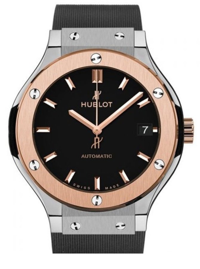 Модель швейцарских часов Hublot Classic Fusion Automatic 38 mm 565.NO.1181.RX выпущены в корпусе из титана и розового золота. Механизм HUB1110 имеет запас хода на 42 часа и функцию автоподзавода. На циферблате, закрытом стеклом из сапфирового кристалла, показываются часы, минуты, секунды, дата. Для фиксации часов на руке предусмотрен ремешок из каучука с титановой вставкой. Часовая разметка и стрелки, что установлены на черном циферблате, выполнены из чистого розового золота. Водонепроницаемость комбинированного корпуса - 50 метров. Часы выпущены в 2020 году.