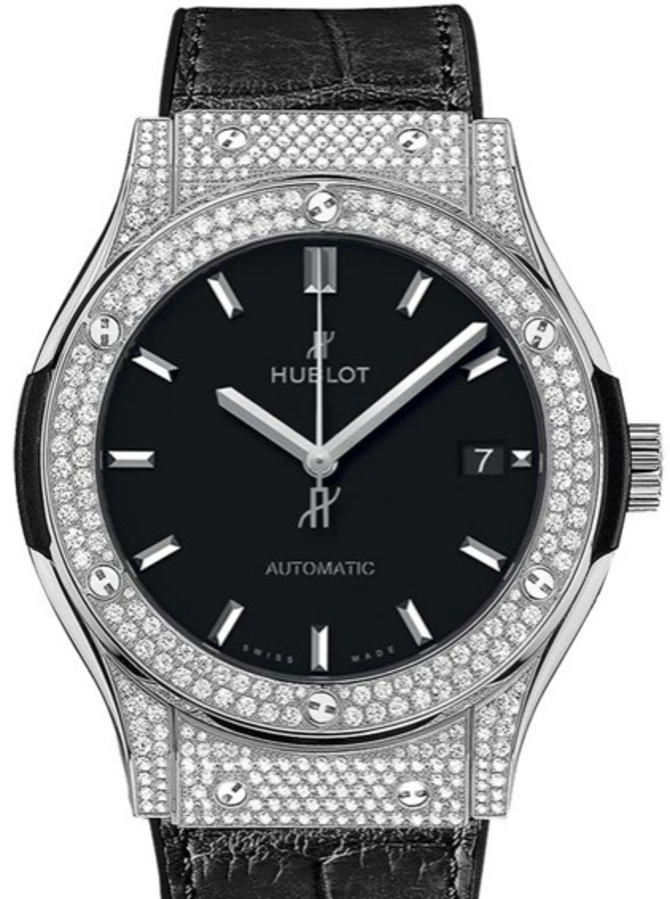 Женские часы Automatic 38 mm от бренда Hublot - это ювелирная модель, которая выпущена с мануфактурным механическим калибром HUB1110, способным проработать 42 часа без подзавода. Циферблат отображает точное время с помощью стрелок из белого золота. Сами стрелки смотрят на часовую разметку также из белого золота. Черный циферблат закрыт сапфировым стеклом с антибликовым напылением. Automatic 38 mm инкрустирован драгоценными камнями по периметру корпуса и фиксатора ремня. Часы представлены в 38-милиметровом корпусе из титана. Он является влагозащищенным и может выдержать давление воды до 50 метров. Hublot комплектуют часы черным ремешком из кожи аллигатора с титановой вставкой. Год выпуска модели 2019.