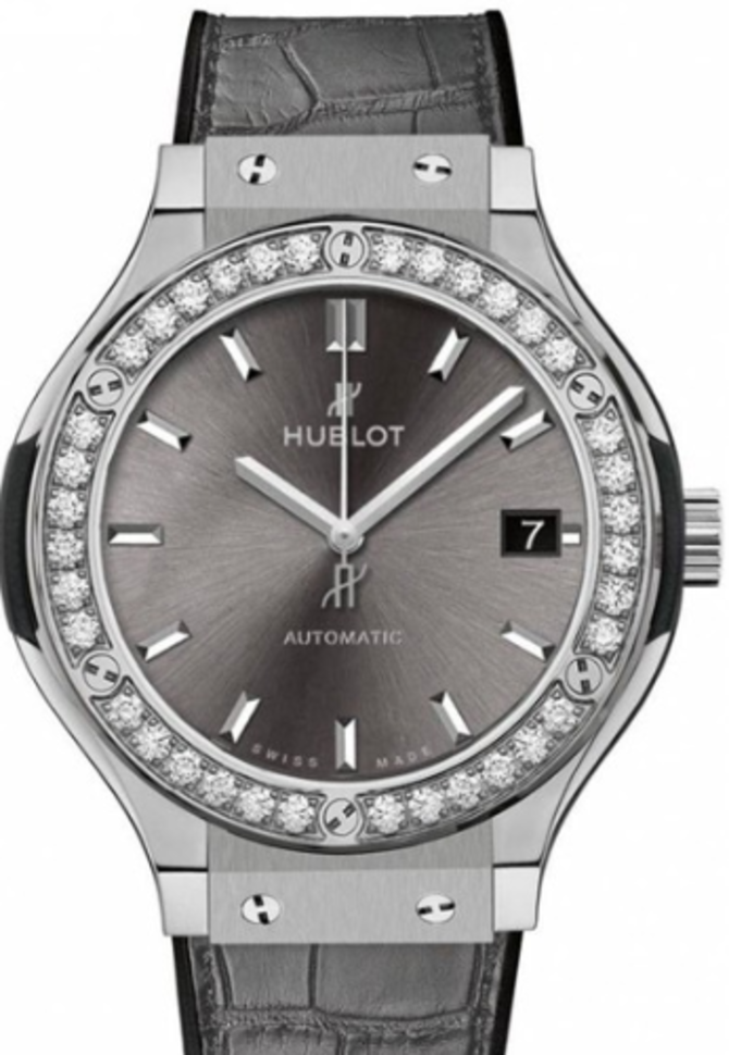 Женские часы Classic Fusion Automatic 38 mm от бренда Hublot - это ювелирная модель, которая выпущена с мануфактурным механическим калибром HUB1110 с запасом хода на 42 часа. Безель инкрустирован белыми классическими 18-каратными бриллиантами. Сатинированный циферблат сверху накрыт сапфировым стеклом с антибликовым составом. Секундная стрелка украшена логотипом компании Hublot. Основные функции модели: индикация часов, минут, секунд и даты. Корпус с 50-ти метровой водонепроницаемостью 38 мм в диаметре. В комплекте идет ремешок из кожи аллигатора с титановой вставкой. Год выхода модели: 2019