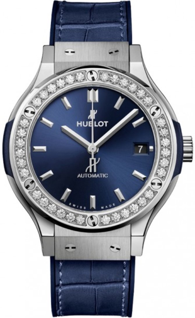 Коллекция Classic Fusion швейцарской часовой марки Hublot пополнилась наручными часами Automatic 38 mm 565.NX.7170.LR.1204, выпущенными в круглом корпусе из титана, диаметром 38 мм, с инкрустацией бриллиантами белого цвета классической огранки. Модель служит для индикации времени и даты, что обеспечивает мануфактурный автоматический калибр HUB1110 от компании Hublot. Синий сатинированный циферблат с титановыми часовыми метками и стрелками накрыт стеклом из сапфирового кристалла. Безель фиксируется с помощью Н-образных винтов из титана. Часы укомплектованы ремнем из натуральной кожи аллигатора синего цвета с каучуковой подкладкой. Застежка выполнена из титана. Корпус обладает 50-метровой влагостойкостью.