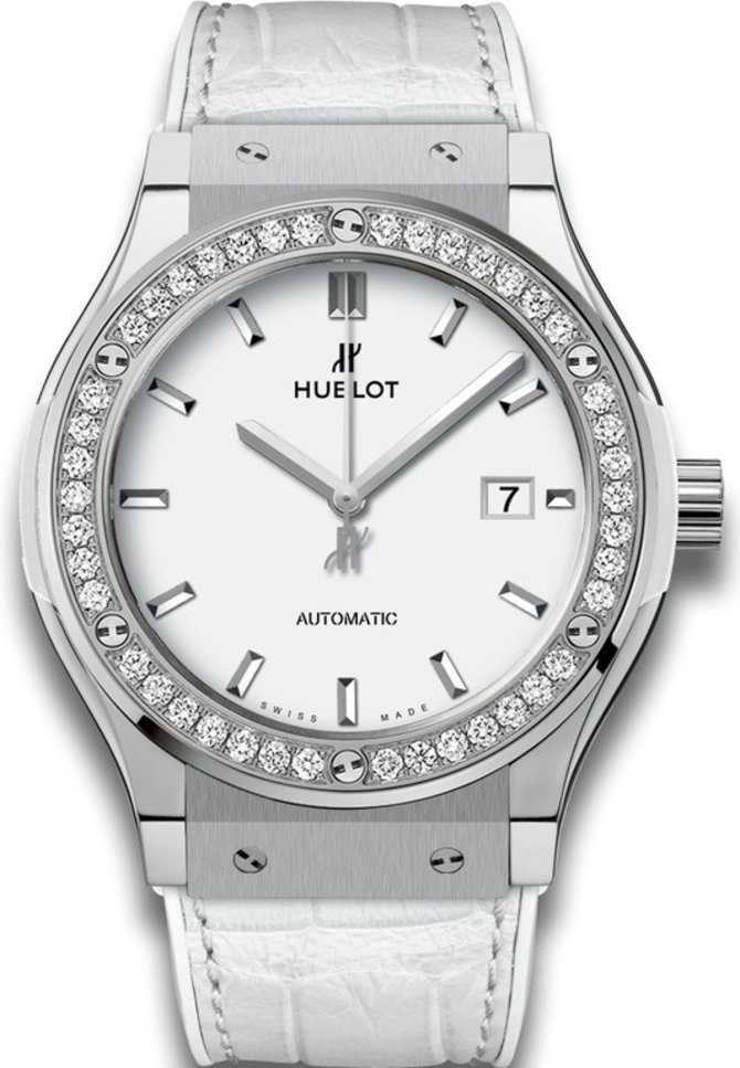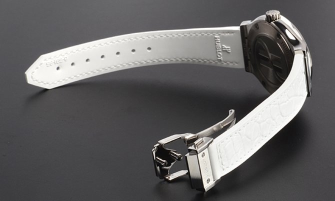 Современные модели Classic Fusion создаются с использованием современных материалов. Швейцарские часы коллекции Classic Fusion 581.NE.2010.LR.1204 выполнены с использованием титана и представлены в диаметре 33 милиметров. Обладают водонепроницаемостью до 50 метров. Безель инкрустирован белыми бриллиантами и закреплен 6 Н-образными винтами. Круглый белый циферблат наручных часов защищен сапфировым стеклом с антибликовым покрытием. Часовые метки багетной формы расположены по кругу циферблата, а стрелки часов, минут, секунд - в центре него. На 3-х часах размещено окошко даты. Ремешок изготовлен из кожи аллигатора и каучуковой подкладки белого цвета, оснащен титановой раскладывающейся застежкой. Внутри корпуса установлен кварцевый часовой механизм HUB2912.