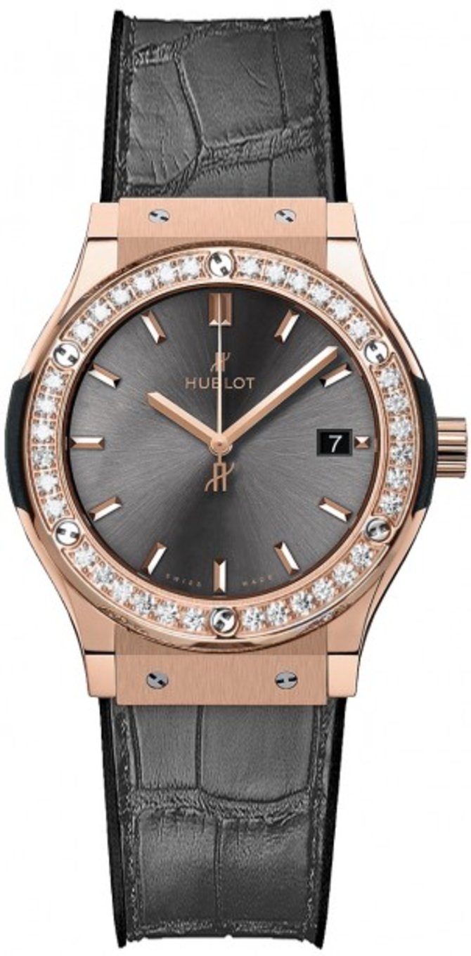 Коллекция Classic Fusion швейцарской часовой марки Hublot пополнилась наручными часами Quartz 33 581.OX.7081.LR.1104, выпущенными в круглом корпусе из розового 18-каратного золота, диаметром 33 мм, с инкрустацией бриллиантами белого цвета классической огранки. Модель служит для индикации времени и даты, что обеспечивает мануфактурный часовой калибр кварцевого типа от компании Hublot. Черный сатинированный циферблат с золотыми часовыми метками и стрелками накрыт стеклом из сапфирового кристалла. Безель фиксируется с помощью Н-образных винтов из титана. Часы укомплектованы ремнем из натуральной кожи аллигатора черного цвета с каучуковой подкладкой. Застежка выполнена из золота. Корпус обладает 50-метровой влагостойкостью.