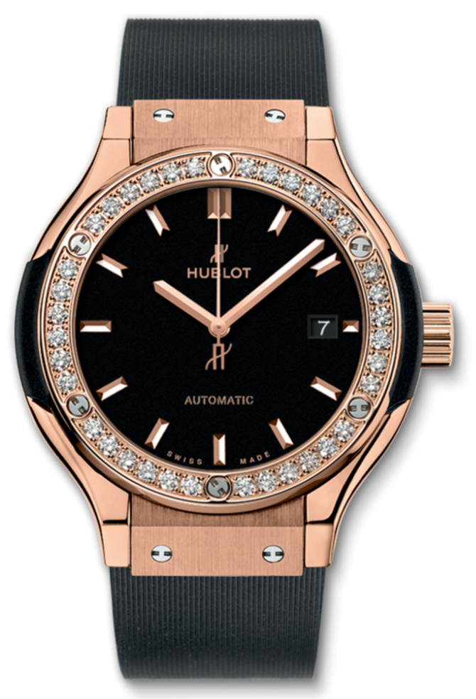 Швейцарский бренд по производству наручных часов люкс-класса Hublot представляет модель в классическом стиле из розового золота с инкрустацией бриллиантами классической огранки. Мануфактурный механический калибр HUB1120 с автоматическим подзаводом обеспечивает индикацией часов, минут, секунд и даты. Стекло сапфировое защищает циферблат от малейших повреждений. Часовая, минутная и секундная стрелки, а также часовые метки сделаны из розового золота. Ремешок каучуковый черного цвета - в комплекте. Механизм с запасом хода - 40 часов. Герметичность корпуса - 30 метров. Диаметр корпуса - 33 мм.