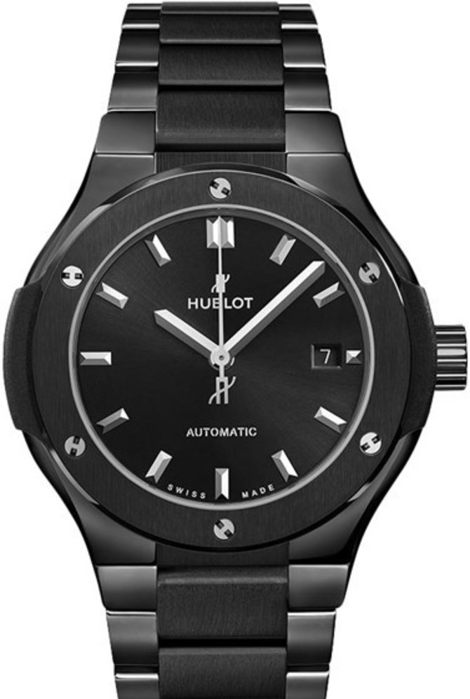 Швейцарские часы Hublot Classic Fusion Automatic 33 mm 585.CM.1470.CM функционируют на механизме HUB1120 мануфактурного производства марки Hublot. Механизм работает от ротора автоподзавода и имеет 42 часа запаса хода. Круглый корпус часов выполнен из черной керамики, диаметром 33 мм, имеет 50-метровый уровень герметичности. Сатинированный циферблат черного цвета от повреждений защищает стекло из сапфирового кристалла. Браслет из керамики оснащен раскладной застежкой. Безель крепится к корпусу титановыми винтами, выполненными в форме буквы Н - начальной буквы в названии марки Hublot. Часы выпущены в 2019 году.