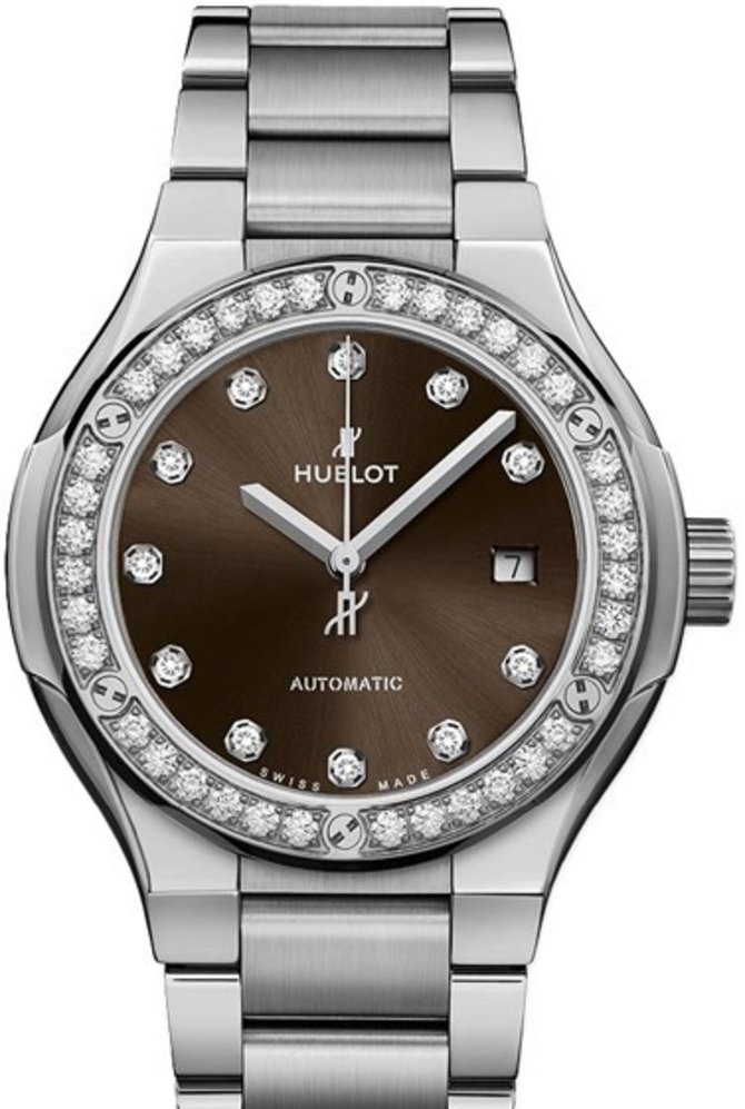 Установленный внутри корпуса мануфактурный часовой калибр HUB1120 производства компании Hublot обеспечивает индикацию на сатинированном коричневом циферблате данных часов, минут, секунд, даты. Циферблат накрыт стеклом из прочного сапфирового кристалла с антибликовыми свойствами сверху. Стрелки из титана указывают на бриллиантовую часовую разметку. Корпус, диаметром 33 мм, выполнен из титана. Браслет, которым укомплектованы часы, выполнен из титана. Дополнен браслет двойной раскладной застежкой из титана. Герметичность корпуса - 50 метров. Безель инкрустирован бриллиантами классической огранки и прикреплен к корпусу титановыми винтами формы буквы Н.