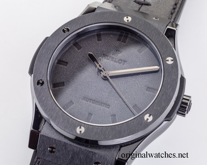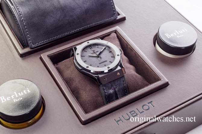 Часовая мануфактура из Швейцарии Hublot презентовала данную модель механических часов коллегиально с легендарным производителем кожаных изделий Berluti. Из высококачественной кожи "Venezia" от бренда Berluti произведен и ремешок для фиксации часов на запястье, и циферблат для индикации текущего времени. Корпус произведен из черной керамики. Размеры корпуса: 45 мм х 10.95 мм. В таких габаритах поместился автоматический мануфактурный калибр HUB1100 с 42-часовым запасом хода. Модель выпущена ограниченной серией - 500 экземпляров. Герметичность керамического корпуса - 50 метров. Сапфировое стекло стоит на страже циферблата. Застежка, дополняющая ремешок, выполнена из титана.