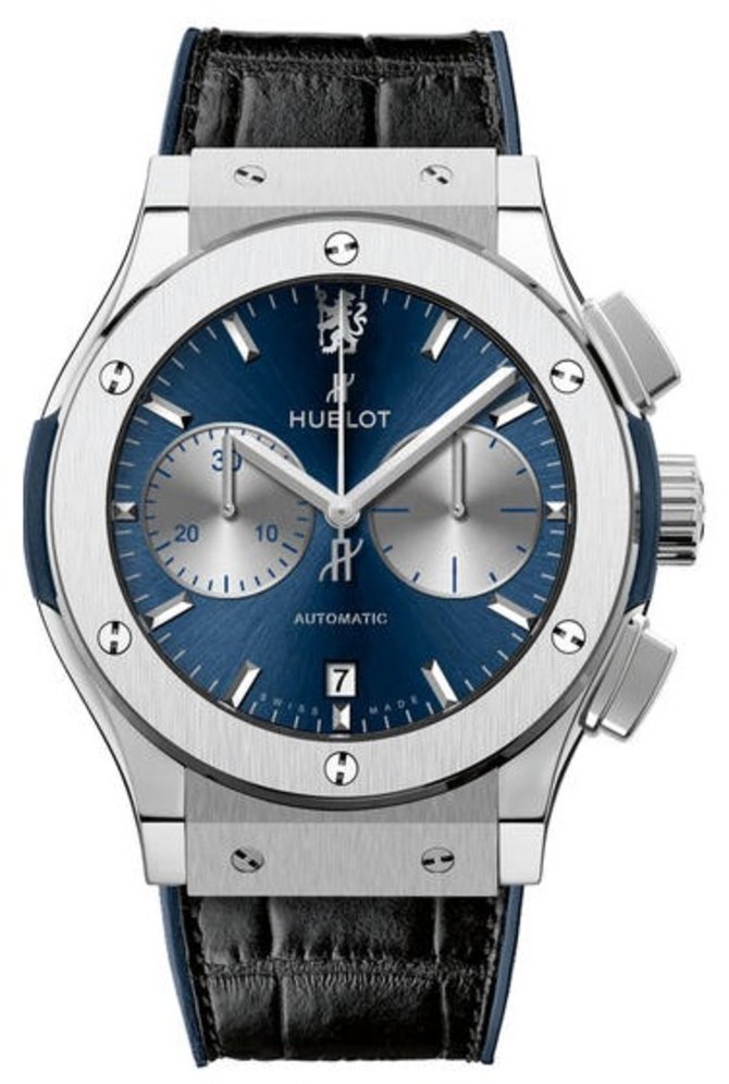 В 2016 году швейцарская часовая марка Hublot выпустила модель спортивных часов с хронографом, на синем циферблате которых указываются часы, минуты, секунды, дата, а также все необходимые данные для функции хронографа. В корпусе из титана, диаметром 45 мм, расположен автоматический мануфактурный механизм. Титан матово-полированный. Герметичность корпуса, заявленная производителем - 50 метров. Верх ремешка - натуральная крокодилья кожа, подкладка - каучук. Раскладывающаяся застежка выполнена из стали. Сапфировое стекло с антибликовым покрытием надежно защищает циферблат от непредвиденных повреждений.