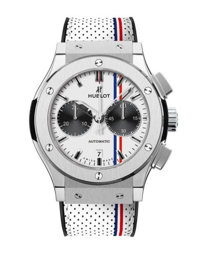 Многофункциональные швейцарские наручные часы, выпущенные в 2013 году швейцарской часовой мануфактурой Hublot в честь самых престижных гонок коллекционных автомобилей в Европе, функционируют на швейцарском мануфактурном калибре от Hublot с автоподзаводом и функцией хронографа, который отмечен официальным сертификатом хронометра COSC (швейцарский институт хронометрии). На белом циферблате при помощи стрелок, индексов и меток из титана, указываются часы, минуты, секунды, дата и данные хронографа. Корпус, диаметром 45 миллиметров, изготовлен из титана. Циферблат покрыт натуральным сапфировым стеклом. Герметичность корпуса - 50 метров (5 атм.). Модель Chronograph Tour Auto укомплектована кожаным ремешком с каучуковой подкладкой и стальной пряжкой. Лимитированный тираж - 100 экземпляров!