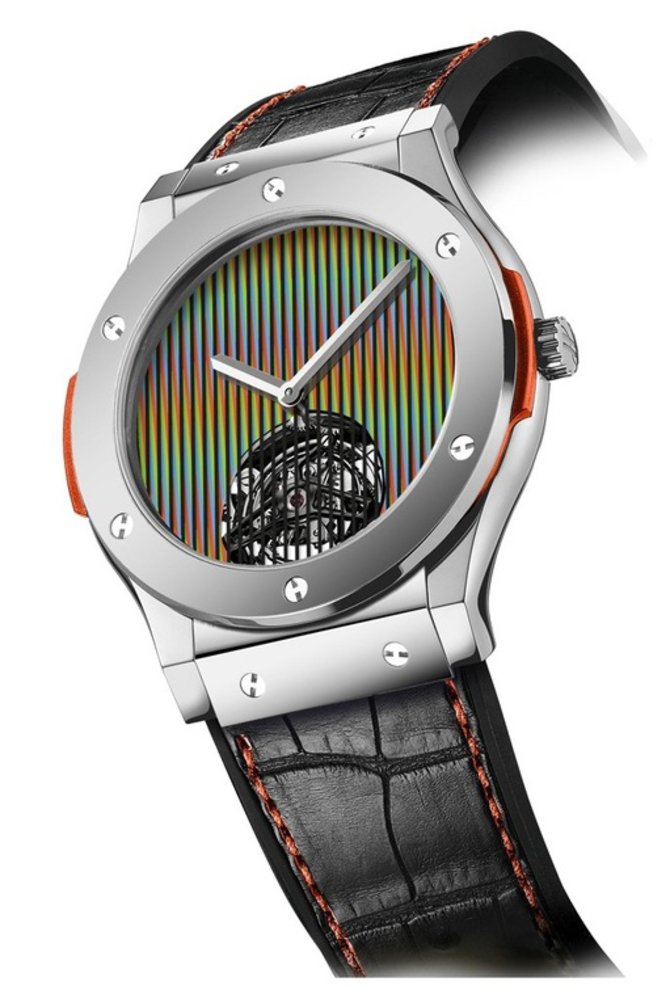 Новая модель наручных часов "Classic Fusion Tourbillon Cruz-Diez", от часовой компании Hublot, создана в единственном экземпляре! Часы функционируют на мануфактурном швейцарском механизме с ручным подзаводом и функцией турбийона, с запасом хода - 115 часов. Механизм размещен в круглом 45-миллиметровом корпусе из платины. На часовом циферблате с разноцветной модельной аппликацией указывается текущее время в часах и минутах. Часы комплектуются ремешком из кожи крокодила с каучуковой подкладкой и пряжкой из платины. Фирменные H-образные винты, фиксирующие безель и ремешок к корпусу, изготовлены из платины.