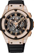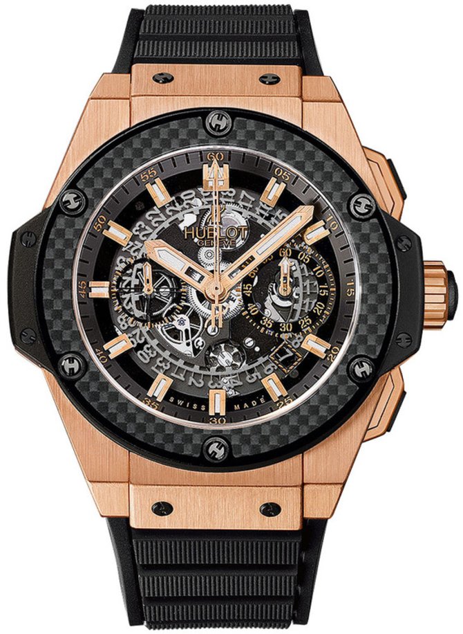 Очередная великолепная модель мужских наручных часов из серии King Power Unico King Gold 701.OQ.0180.RX от часовых мастеров производителя Hublot не оставит к себе никого равнодушным, потому как завораживает своим внешним непревзойденным видом и функциональностью. Наличие хронографа и повышенная водостойкость - подчеркивают функционал данной модели. Круглый комбинированный корпус выполнен из 18-каратного розового золота и карбона, и имеет такие размеры: 48 мм в диаметре. Автоматический механизм данной модели оснащен калибром HUB 1240, и имеет запас хода на 42 часа. Прочные сапфировые стекла, устойчивые к царапинам и другим повреждениям закрывают корпус с обеих сторон. На черном циферблате шикарно смотрятся отлитые вручную золотистые стрелки. Водонепроницаемость данной модели повышена и составляет 100 метров. Ремешок черный, каучуковый, оснащен титановой вставкой.