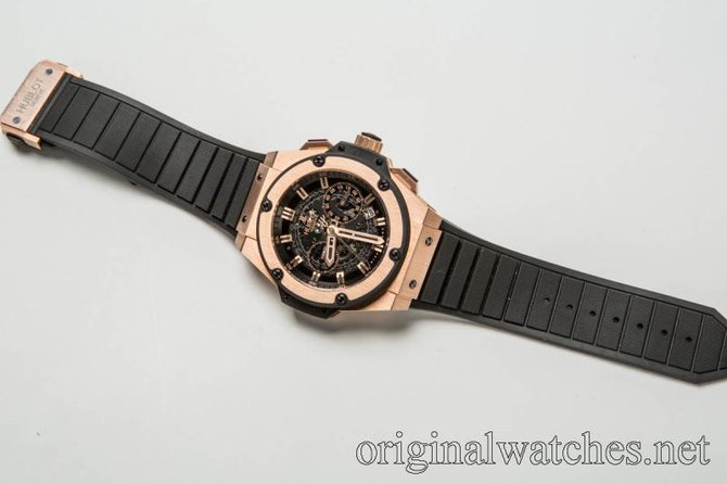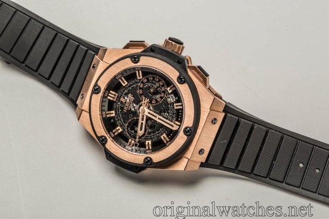 Очередная великолепная модель мужских наручных часов из серии King Power Unico King Gold 701.OX.0180.RX от часовых мастеров производителя Hublot не оставит к себе никого равнодушным, потому как завораживает своим внешним строгим видом и функциональностью. Наличие хронографа и повышенная водостойкость как раз таки подчеркивает функционал данной модели. Круглый комбинированный корпус выполнен из 18 каратного розового золота и каучука, и имеет такие размеры: 48 мм в диаметре. Автоматический механизм данной модели оснащен калибром HUB 1240, и имеет запас хода на 72 часа. Прочные сапфировые стекла, устойчивые к царапинам и другим повреждениям закрывают корпус с обеих сторон. На черном циферблате шикарно смотрятся отлитые вручную позолоченные стрелки. Водонепроницаемость данной модели повышена и составляет 100 метров. Ремешок черный, каучуковый, оснащен 18-каратной золотой вставкой. Серия данной модели ограничена всего лишь в 500 экземпляров.
