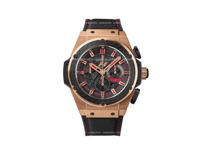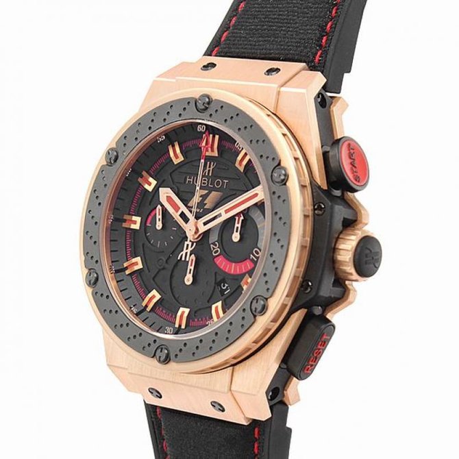 Очередная великолепная модель мужских наручных часов из серии King Power F1 Gold 703.OM.1138.NR.FMO10 от часовых мастеров производителя Hublot не оставит к себе никого равнодушным, потому как завораживает своим внешним непревзойденно фантастическим видом и функциональностью. Наличие хронографа как раз таки подчеркивает функционал данной модели. Круглый комбинированный корпус выполнен из таких материалов как керамика, каучук, титан, и 18-каратное розовое золото и имеет такие размеры: 48 мм в диаметре. Автоматический механизм данной модели оснащен калибром HUB 4100, и имеет запас хода на 42 часа. Прочные сапфировые стекла, устойчивые к царапинам и другим повреждениям закрывают корпус с обеих сторон. На черном циферблате шикарно смотрятся отлитые вручную позолоченные стрелки. Апертура с датой находится на позиции между 4 и 5 часами. Водонепроницаемость данной модели повышена и составляет 100 метров. Ремешок черный, каучуковый, оснащен керамической вставкой. Серия данной модели ограничена всего лишь в 250 экземпляров.
