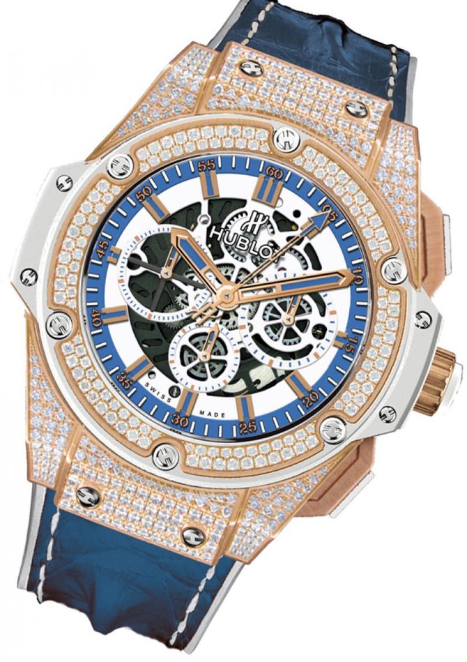 Очередная потрясающая модель мужских наручных часов из серии King Power Miami "305" 710.OE.2189.HR.1704.MIA12 от часовых мастеров производителя Hublot не оставит к себе никого равнодушным, потому как завораживает своим внешним очень красивым видом и функциональностью. Наличие хронографа как раз таки подчеркивает функционал данной модели. Круглый корпус выполнен из 18-каратного розового золота, и имеет такие размеры: 48 мм в диаметре. Автоматический механизм данной модели оснащен калибром HUB4214, и имеет запас хода на 42 часа. Прочные сапфировые стекла, устойчивые к царапинам и другим повреждениям закрывают корпус с тыльной стороны, а задняя крышка из розового золота закрыта под давлением. На белом циферблате великолепно смотрятся отлитые вручную позолоченные стрелки. Водонепроницаемость данной модели повышена и составляет 100 метров. Ремешок синий, комбинированный, выполнен из кожи аллигатора и каучука, оснащен вставкой из 18-каратного розового золота, и откидной застежкой. Любители бриллиантов не смогут пройти мимо модели, так как корпус инкрустирован белыми бриллиантами. Серия ограничена всего лишь в 10 экземпляров.