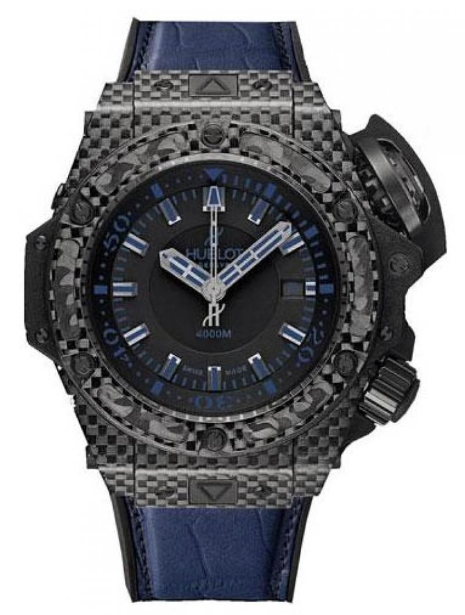 Дайверская модель часов King Power Oceanographic 4000 King Gold от компании Hublot с почти рекордной водостойкостью в 4000 метров или 400 атм. Корпус выполнен из карбона с элементами из черной композитной резины, диаметром 48 мм. Вращающийся внешний диск циферблата с разметкой времени погружения управляется защищенной переводной головкой. Механизм автоматический HUB1401 состоит из 180 компонентов, на 23 камнях, с запасом хода 42 часа. Мосты и платина с родиевым покрытием и матовой шлифовкой. Поставляется на каучуковом ремешке синего цвета.