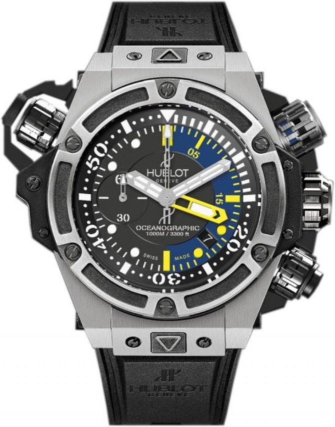 Компания HUBLOT официально представила модель King Power Oceanographic 1000, ограниченным тиражом, которые порадуют своей простой функциональностью и технологичностью. Часы выпущены в четырех вариантах. Одна в корпусе из карбона Ref.:732.QX.1140.RX, лимитированная серия 1000 экземпляров. Две из высокотехнологичного материала King Gold, Ref 732.OE.2180.RW лимитированная серия 100 экземпляров, Ref: 732.OX.1180.RX лимитированная серия 200 экземпляров. и последняя модель в титановом корпусе Ref:732.NX.1127.RX лимитированная серия 1000 экземпляров.