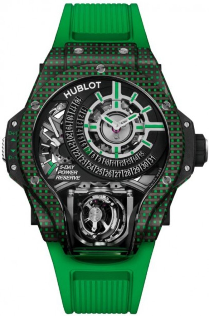 Наручные мужские часы Hublot MP Collection MP-09 Tourbillon Bi-Axis 5 Day Power Reserve 3D Carbon 909.QDG.1120.RX обладают мануфактурным калибром HUB9009.H1.RA.В, который отличается наличием функции турбийона для нивелирования влияния земной гравитации на точность хода механизма, а также высоким запасом хода, рассчитанным на 5 дней работы без подзавода. Крупный корпус, размером 49 х 17.95 мм, выполнен из карбона. В комплекте поставляется ремень из каучука зеленого цвета с керамической вставкой. Под стеклом из сапфирового кристалла на циферблате показываются часы, минуты, секунды, дата, запас хода. Водонепроницаемость корпуса - 30 метров. Часы выпущены лимитированным тиражом - 8 экземпляров.