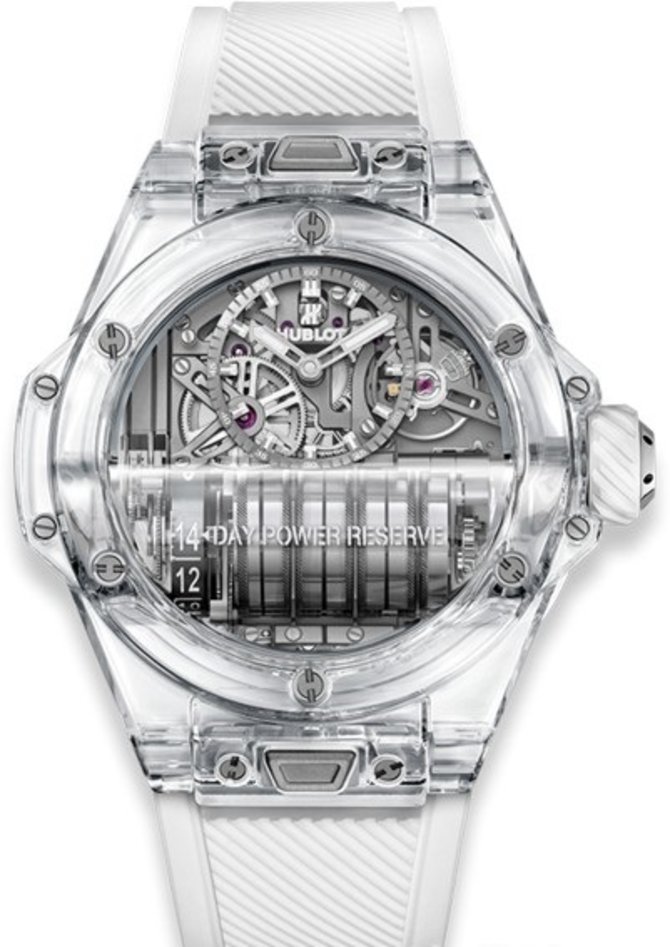 Внутри корпуса из сапфирового стекла, диаметром 45 миллиметров, установлен механический калибр HUB9011 мануфактурного производства компании Hublot. У данного механизма есть одна важная и полезная особенность - это длительный резерв хода, которого хватает на 14 дней работы механизма без подзавода. В действие калибр приводит ручной подзавод. Функции, которые указываются на циферблате: часы и минуты, а также остаток запаса хода механизма. Каучуковый ремень белого цвета дополнен раскладной застежкой, выполненной из титана. Циферблат защищен сапфировым стеклом. Задняя крышка выполнена также из сапфирового кристалла.Лимитированный тираж модели Hublot MP Collection MP-11 Power Reserve 14 Days 45 mm 911.JX.0102.RW - 200 экземпляров.