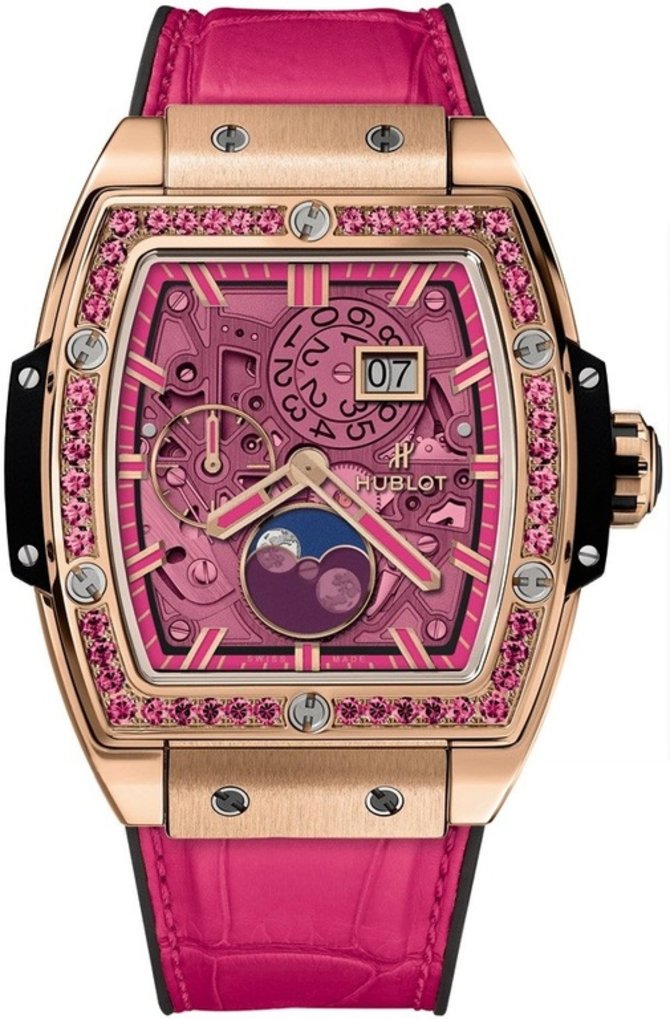 Эта женская модель швейцарских наручных часов создана мануфактурой Hublot и помещена в коллекцию этого бренда - "Spirit of Big Bang". Ювелирный бочкообразный корпус новинки 2017 года изготовлен из 18-каратного розового золота и инкрустирован драгоценными камнями - 48-ю розовыми сапфирами. Механизм работает с помощью ротора автоматического подзавода, обладает 50-часовым запасом хода и гарантирует индикацию часов, минут, секунд, даты, фаз Луны. Ремешок представлен в виде комбинации кожи крокодила и каучука (служит подкладкой). Герметичность корпуса - 100 метров. Безель фиксируется титановыми винтами в количестве 6 штук. Размеры корпуса: 42 х 13.8 мм. Накрывается циферблат сапфировым стеклом.