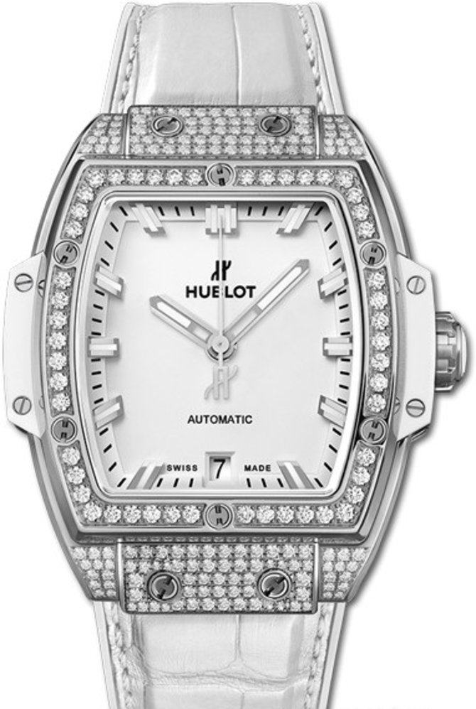 Швейцарские часы от швейцарской мануфактуры Hublot - ювелирная модель Spirit of Big Bang Titanium Pave 39 mm 665.NE.2010.LR.1604. Бочкообразный часовой корпус сделан из титана, диаметром 39 мм, и инкрустирован бриллиантами классической огранки. Механизм HUB1710 мануфактурного производства Hublot наделен функцией автоподзавода и запасом хода на 50 часов работы. Циферблат, защищенный стеклом из сапфира, с накладными часовыми метками и стрелками с люминесцентным составом. Ремень из натуральной кожи аллигатора белого цвета имеет каучуковую подкладку. Модель Spirit of Big Bang Titanium Pave 39 mm 665.NE.2010.LR.1604 выпущена в 2019 году.