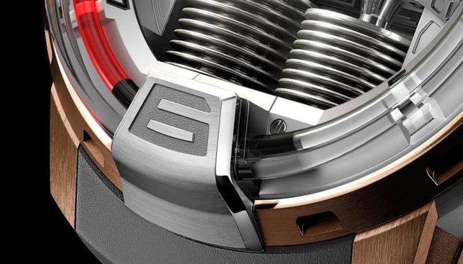 Резервуары с жидкостью расположены в позиции 6 часа. Когда один из резервуаров сжимается, второй расширяется, и, наоборот, обеспечивая тем самым движение жидкости в капилляре. По мере того как «течет» время, люминесцентная жидкость продвигается вперед. Мениск в форме полумесяца отмечает предел между жидкостями, индексирующими время. В позиции 6 часа располагается последний пункт. Затем жидкость движется в исходное положение. Два сильфона, поддерживающие резервуары, изготовлены из прочного, гибкого термоизоляционного сплава, и приводятся в движение при помощи поршня. Вся эта гидро-система работает на базе механического калибра с ручным заводом.