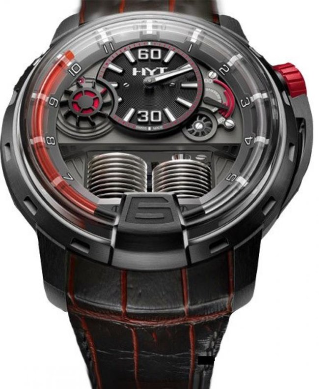 Новинка от компании 2014 года часы с округлым корпусом из титана черное DLC-покрытие, диаметр 48,8 мм, толщина 17,9 мм, водонепроницаемость 100 метров. Около 2-х часовой отметки размещена заводная головка с резиновой вставкой красного цвета. Циферблат модели многоуровневый, защищен сапфировым выпуклым стеклом с антибликовым покрытием. Имеется второй циферблат с арабскими цифрами и стрелкой, с помощью нее осуществляется индикация минут. Отображение часов происходит с помощью изменения уровня красной люминесцентной жидкости, находящейся в округлой трубке возле 6-ти часовой отметки. Указатель круглой формы между 9-ти и 10-ти часовыми отметками отображает секунды, а аналоговый указатель между 2-х и 3-х часовыми отметками отображает запас хода (65 часов). Часы H1 Dracula DLC собраны на основе калибра HYT 101 с ручным заводом 35 камней, частота 28800 пк в час. Комплектуется черным ремешком из кожи крокодила с красной прошивкой, со вставкой из титана с черным покрытием DLC и каучуковым ремешком черного цвета. Серия ограничена 50 экземпляров.