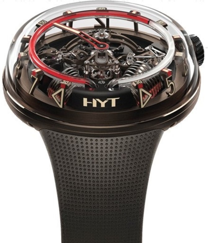 Швейцарские часы для мужчин HYT H2O 251-AD-463-RF-RU оснащены мануфактурным механизмом с ручным заводом от инженеров марки HYT. Механический калибр обладает индикатором запаса хода и термальным индикатором. Высокая точность и надежность механизма обеспечивает запас хода на 8 дней работы без подзавода. Скелетонированный циферблат защищен надежным сапфировым стеклом с противобликовым составом. Водонепроницаемость корпуса находится на уровне 30 метров. В комплекте с моделью H2O идет каучуковый ремень черного цвета и стальная пряжка. Корпус изготовлен из нержавеющей стали с покрытием PVD. Наручные часы HYT H2O выпущены лимитированной серией из 8 экземпляров.