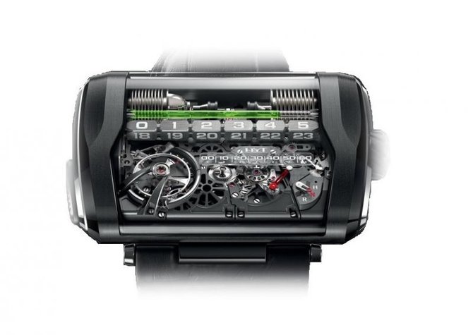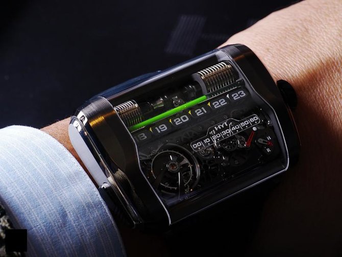 Серия ограничена - 25 экземпляров! Данная модель часового мастерства от HYT представляет собой миниатюрный механизм (гидравлический) с двумя сосудами, предназначенными для двух видов жидкости. Одна жидкость прозрачная, а вот другая окрашена в зеленый цвет. Меняя давление, часовой механизм меняет объем жидкостей, тем самым вместе с циферблатом индицирует время на данную минуту. Корпус модели комбинированный, прямоугольный. Он выполнен из титана с покрытием PVD и платины. Также на время, кроме уровня жидкости, указывают кубики с цифрами. За индикацию минут отвечает классическая стрелка. Защитное стекло сапфировое. Все внутренне элементы помещены в маленькую капсулу из сапфирового стекла. Ремешок, которым укомплектована модель, пошит из крокодильей кожи. В механизме используются 53 драгоценных камня. Балансовая частота - 21 600 пк/час. Запас хода внушительный - 170 часов. Размеры корпуса: 62 х 41 х 16 мм. Серия ограничена 25-ю экземплярами.