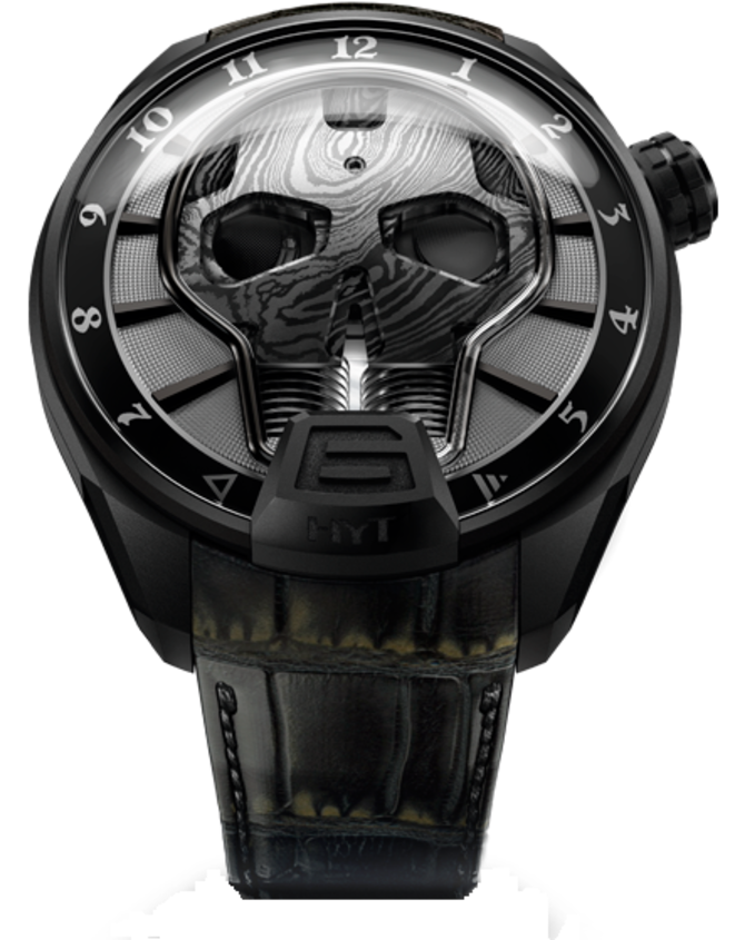 Механические швейцарские часы HYT Skull Bad Boy выполнены в черном цвете из титана с покрытием DLC. Размер корпуса часов 51 мм с водонепроницаемостью до 50 м. Узор часов HYT представляет собой "череп маори", который ассоциируется с татуировками племени маори. Этот узор занимает всю поверхность циферблата. Оригинальность корпусу придает также часовая стрелка, которая выполнена в виде прозрачной трубки с флуоресцирующей жидкостью. Правый глаз черепа - это индикатор запаса хода часов, левый глаз - ход секунд. Циферблат защищен сапфировым стеклом с антибликовым покрытием. Задняя крышка корпуса изготовлена из сапфирового стекла. Заводная коронка имеет резиновое покрытие. Ремешок выполнен в черном цвете из текстиля, а пряжка - из титана с покрытием DLC .