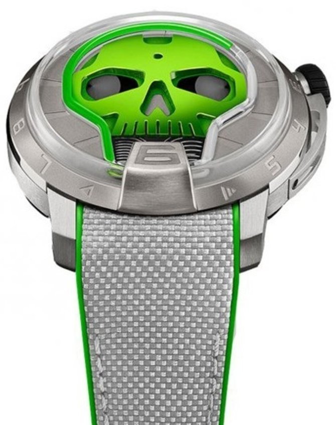 Корпус мужских часов HYT Skull S48-TT-35-GF-RA выполнен в круглой форме из титана, размером 51 мм х 48.8 мм х 17.9 мм. Матерчатый ремень серого цвета оснащен титановой классической пряжкой. На циферблате с зеленым черепом показываются часы, минуты и запас хода. Стекло, которым накрыт циферблат и выполнена задняя крышка корпуса, сделано из сапфирового кристалла с нанесением на него антибликового покрытия. Часы выполняют свои функции благодаря механизму с ручным подзаводом мануфактурного производства HYT. Модель имеет 100-метровую герметичность. Часы выпущены лимитированной серией - 50 штук.