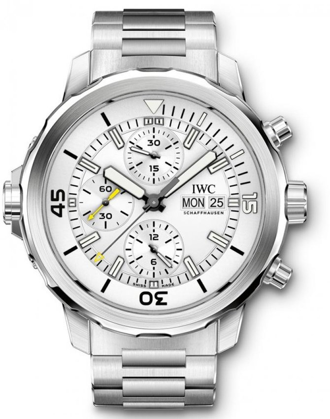 Модель водостойких часов Aquatimer Chronograph от часового бренда-производителя IWC с хронографом. Часы вышли в корпусе круглой формы, диаметром 44 мм и толщиной 17 мм, из нержавеющей стали высшего качества. Защита механизма осуществляется на глубине до 300 метров. В корпусе расположился механизм с автоматическим заводом, Калибр 79320, с запасом хода - 44 часа. Циферблат серебристого цвета осуществляет индикацию часов, минут, секунд, даты и дней недели. В комплекте к часам Aquatimer Chronograph полагается матовый браслет из нержавеющей стали серого цвета со стальной вставкой в виде классической застежки.