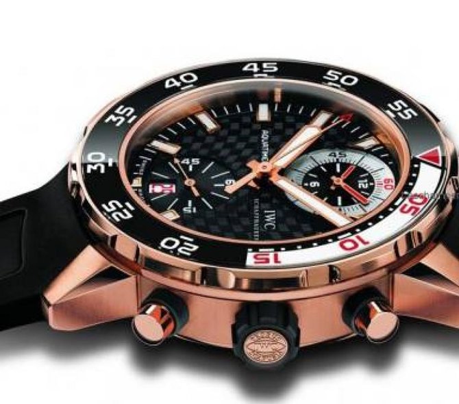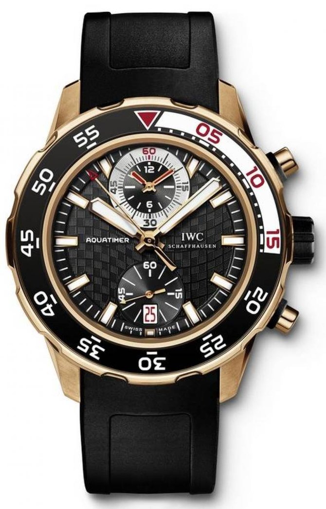 Рассматриваем мужские часы IWC Aquatimer Chronograph 3769 Red Gold. Корпус изготовленный из 18-и кратного розового золота. Циферблат и ремешок в черном цвете и выполнен из высоко качественных материалов. Ремешок выполнен из каучука с классической застежкой. Сапфирное стекло очень устойчив к царапинам. Выдерживают погружение до 120 метров под воду. Часы равняются 44 мм в диаметре и 15,5 мм по толщине. Часы оснащены хронографом/секундомером с функцией "обратного хода" которая позволяет немедленно перезапустить хронограф с одним нажатием кнопки, а если необходимость остановить и затем сбросить секундомер. Часы содержат 40 драгоценных камней и имеют немалый запас хода, который равен 68-ми часам.
