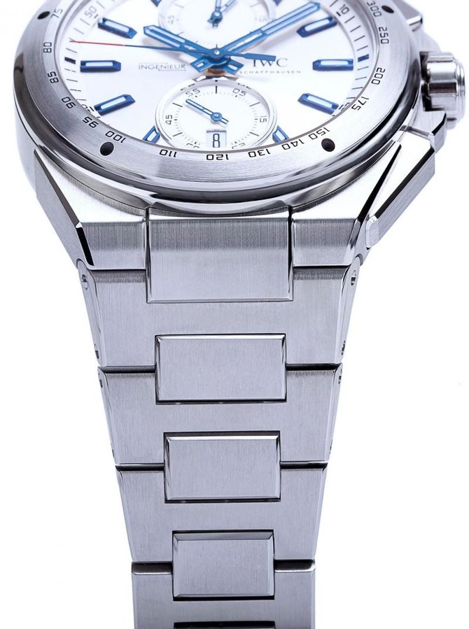 Компания IWC, известная во всем мире, представляет очередные великолепные часы IWC Chronograph Racer IW378510 из коллекции Ingenieur. Очень сложно пройти мимо данной модели и не обратить на неё внимания, так как часы привлекают внешним видом и функциональностью. Одни из главных особенностей данной модели это повышенная водостойкость, наличие хронографа и тахиметра. Круглый корпус часов выполнен из нержавеющей стали. Параметры корпуса: 45 x 15 мм. На серебристом циферблате великолепно смотрятся отлитые вручную из вороненной стали стрелки. Прочное сапфировое стекло закрывает циферблат. Ультратонкий автоматический механизм оснащен калибром IWC 89361, и имеет запас хода на 65 часов. Апертура с датой находится на позиции 6 часов. Браслет выполнен из нержавеющей стали, оснащен раскладывающейся застежкой. Водонепроницаемость модели составляет 120 метров.