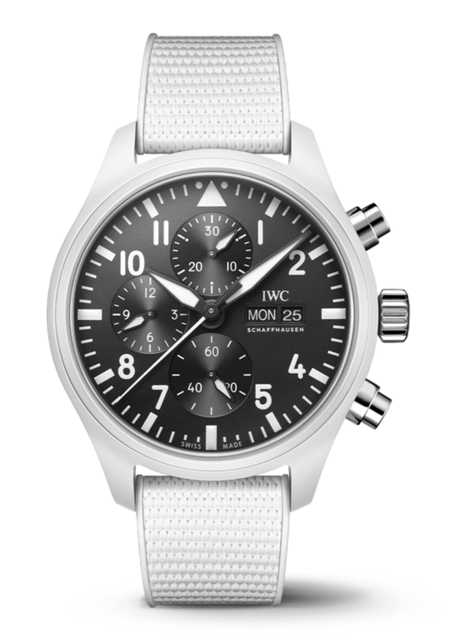 Легендарные часовщики компании IWC представили наручные часы в классическом корпусе круглой формы из натуральной керамики Pilot Watches Chronograph Top Gun Edition "Lake Tahoe". Внутри корпуса установлен автоматический механизм 69380 с запасом хода на 2 суток. Диаметр корпуса: 44.5 мм. Черный циферблат с нанесением люминесцентного покрытия закрыт сапфировым стеклом. Белый каучуковый ремешок укомплектован керамической застежкой. Функции: хронограф с индикацией часов, минут и секунд; указатель даты и дня недели. Годовой выпуск ограничен 1000 экземплярами.