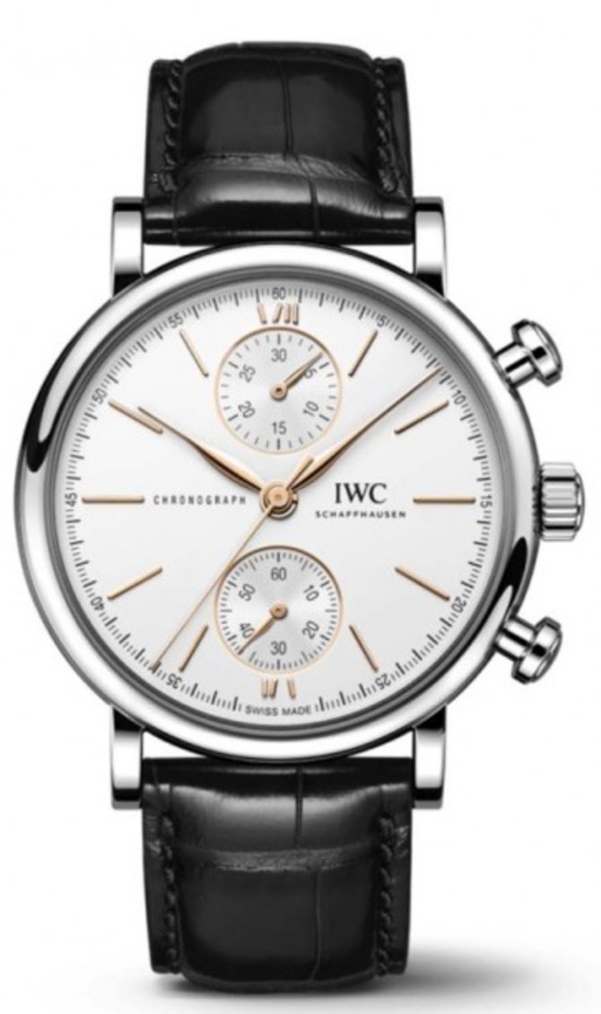 Швейцарский производитель часов класса "люкс" IWC, основанный в 1868 году, в 2021 году представил модель наручных часов с хронографом Portofino Chronograph 39 IW391406 в корпусе круглой формы из нержавеющей стали, размером 39 х 12.8 мм. На белом циферблате, закрытом сапфировым стеклом с антибликовым эффектом, индицируются данные текущего времени и хронографа. Установленный автоматический калибр 79350 производства компании IWC обладает запасом хода на 44 часа работы без подзавода. Водонепроницаемость корпуса рассчитана на 30 метров. Модель комплектуется ремнем из натуральной кожи аллигатора черного цвета с застежкой классического образца из нержавеющей стали. Часовые метки и стрелки выполнены из золота.