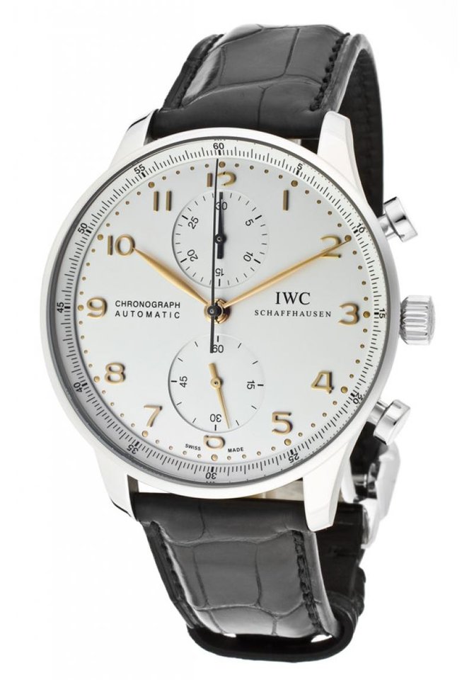 Известная во всем мире компания IWC, представляет очередные великолепные часы из коллекции Portuguese, Chronograph IW371445. Очень сложно пройти мимо данной модели и не обратить на неё внимания, так как часы привлекают внешним классическим видом. Одна из главных особенностей данной модели это наличие хронографа. Круглый корпус часов, выполнен из белого нержавеющей стали и оснащен такими параметрами 40.9 x 12.3 мм. Стрелки отлитые вручную из вороненной стали, позолоченные, великолепно смотрятся на серебристом циферблате. Прочное сапфировое стекло закрывает циферблат. Ультратонкий автоматический механизм оснащен калибром IWC 79350, и имеет запас хода на 44 часа. Ремешок сделан из кожи аллигатора, черного цвета, оснащен раскладывающейся застежкой, а также вставкой из нержавеющей стали. Водостойкость модели составляет 100 футов, что равняется 30 метрам.