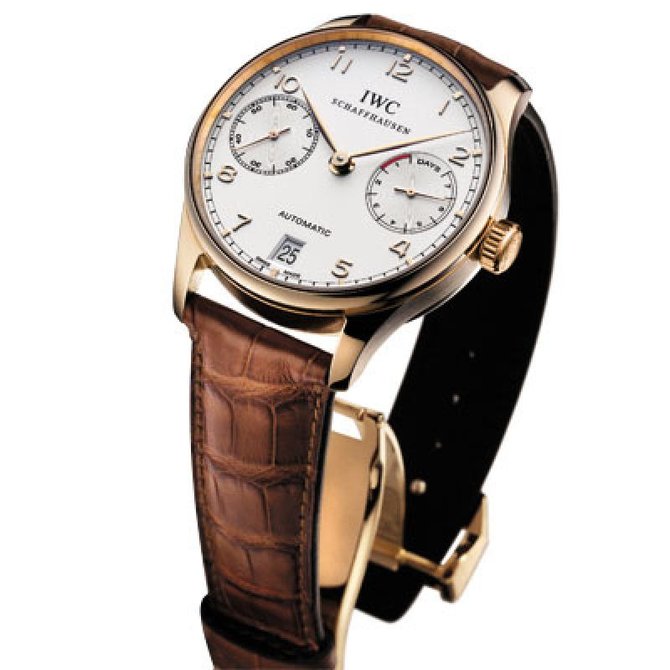 Известная во всем мире компания IWC, представляет очередные великолепные часы из коллекции Portuguese, Automatic IW500106. Очень сложно пройти мимо данной модели и не обратить на неё внимания, так как часы привлекают внешним классическим видом. Одна из главных особенностей данной модели это увеличенный запас хода. Круглый корпус часов, выполнен из розового 18-каратного золота и оснащен такими параметрами 42.3 x 13.9 мм. Стрелки отлитые вручную из вороненной стали, позолоченные, великолепно смотрятся на белом циферблате. Прочное сапфировое стекло закрывает циферблат. Апертура с датой находится на позиции 6 часов. Ультратонкий автоматический механизм оснащен калибром IWC 51010, и имеет запас хода на 7 дней! Ремешок сделан из кожи аллигатора, коричневого цвета, оснащен раскладывающейся застежкой, а также вставкой из 18-каратного розового золота. Водостойкость модели составляет 100 футов, что равняется 30 метрам.