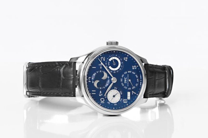 Компания IWC, известная во всем мире, представляет очередные великолепные часы IWC Perpetual Calendar 5023 IW503203 из коллекции Portuguese. Очень сложно пройти мимо данной модели и не обратить на неё внимания, так как часы привлекают внешним классическим видом. Одно из главных достоинств данной модели это наличие вечного календаря, отображение фаз луны. Круглый полированный корпус часов выполнен из 18-каратного белого золота. Параметры корпуса:44.2 x 15.5 мм. На синим циферблате великолепно смотрятся посеребренные отлитые вручную из вороненной стали стрелки. Прочное сапфировое стекло закрывает циферблат. Задняя крышка закрыта под давлением. Ультратонкий автоматический механизм оснащен калибром IWC 51614, и имеет запас хода на 7 дней. Ремешок выполнен из кожи аллигатора, черного цвета, оснащен раскладывающейся застежкой а также вставкой из 18-каратного белого золота. Водонепроницаемость модели составляет 100 футов, что равняется 30 метрам.