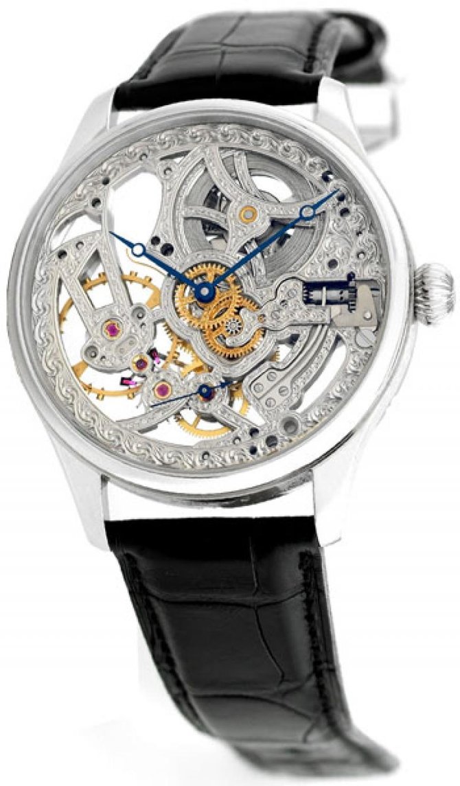 Известная во всем мире компания IWC, представляет очередные великолепные часы из коллекции Portuguese, F.A. Jones Skeleton IW544205. Очень сложно пройти мимо данной модели и не обратить на неё внимания, так как часы привлекают внешним необычным видом. Одна из главных особенностей данной модели это циферблат скелетон. Круглый корпус часов, выполнен из платины 950 пробы и оснащен такими параметрами 43 x 11.7 мм. Стрелки отлитые вручную из вороненной стали, великолепно смотрятся на серебристом циферблате. Прочное сапфировое стекло закрывает циферблат. Запас хода данной модели равен 68 часам. Ремешок сделан из кожи аллигатора, черного цвета, оснащен раскладывающейся застежкой, а также вставкой из платины. Водостойкость модели составляет 100 футов, что равняется 30 метрам. Серия данной модели ограничена всего лишь в 50 экземпляров.