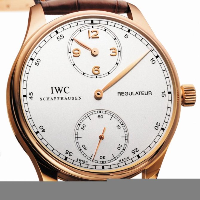 Компания IWC, известная во всем мире, представляет очередные великолепные часы IWC Regulateur IW544402 из коллекции Portuguese. Очень сложно пройти мимо данной модели и не обратить на неё внимания, так как часы привлекают внешним классическим видом. Одно из главных достоинств данной модели это наличие двух дополнительных циферблатов. Круглый корпус часов выполнен из 18-каратного розового. Параметры корпуса: 43.1 мм в диаметре. На белом циферблате великолепно смотрятся позолоченные отлитые вручную из вороненной стали стрелки. Прочное сапфировое стекло закрывает циферблат. Задняя крышка закрыта под давлением. Ультратонкий автоматический механизм оснащен калибром IWC 98245, и имеет запас хода на 46 часов. Ремешок выполнен из кожи аллигатора, светло-коричневого цвета, оснащен раскладывающейся застежкой а также вставкой из 18-каратного розового золота. Водонепроницаемость модели составляет 100 футов, что равняется 30 метрам.