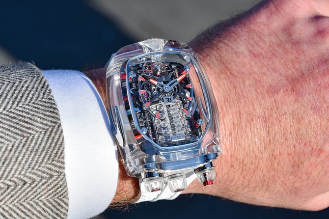 Впечатляющие и эксклюзивные наручные часы представлены лимитированной серией из 7 экземпляров брендом Jacob & Co. Модель сделана полностью из сапфирового стекла с антибликовым покрытием и имеет огромный размер: 57,8 мм х 44,4 мм х 21,5 мм. Фирменная решетка радиатора в форме подковы в полдень. Часовые метки, амортизаторы и каретка турбийона окрашены в красный цвет. Цвета Франции гордо представляют индикатор запаса хода. Механизм JCAM37 собственного производства с запасом хода 60 часов. Комфортный для ношения вентилируемый белый каучуковый ремешок с раскладывающейся застежкой из титана.