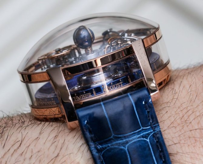 Швейцарские мужские наручные часы Jacob & Co. Astronomia Gravitational Triple Axis Tourbillon Black Gold - это уменьшенная копия небесных тел, которую можно разместить на собственном запястье. В часах установлен калибр JCAM11 с турбийоном, который работает от ручного подзавода. Основа корпуса выполнена из розового золота с покрытием DLC, остальное - сапфировое стекло. Ремешок к часам пошит из крокодиловой кожи синего цвета. Застежка классическая, из золота. Корпус, диаметром 47 мм. Скелетонизированный циферблат указывает данные часов, минут, секунд. Запас хода механизма - 60 часов. Корпус с 30-метровой герметичностью. Лимитированный тираж - всего 18 экземпляров на весь мир. Рекомендованная производителем стоимость модели - 540 000 CHF.
