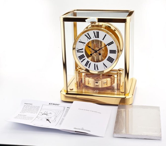 Инженер из Невшателя Жан-Леон Реттер в 1928 году создал часы, которые брали энергию… прямо из воздуха. Вечный двигатель? Да, так называемый вечный двигатель второго рода: он не полностью автономен, поскольку зависит от окружающей среды. Принцип работы часов состоит в следующем: объем газа, помещенного в герметичную камеру, увеличивается и уменьшается в зависимости от изменения температуры воздуха. Стенки капсулы, имеющие форму гармошки, перемещаются и заводят ходовую пружину часов. Референсный номер этой модели настольных часов - 5102202. Часы имеют механический калибр №560. Корпус часов позолоченный - 200 мм x 155 мм x 225 мм. Циферблат у этих часов бело-золотой. Часы Jaeger-LeCoultre являются сочетанием лучших традиций часовой индустрии и великолепного дизайна. Швейцарские часы Jaeger-LeCoultre выполнены из высококачественных материалов и собраны на базе мануфактурных сложных механизмов с самыми разными функциями.